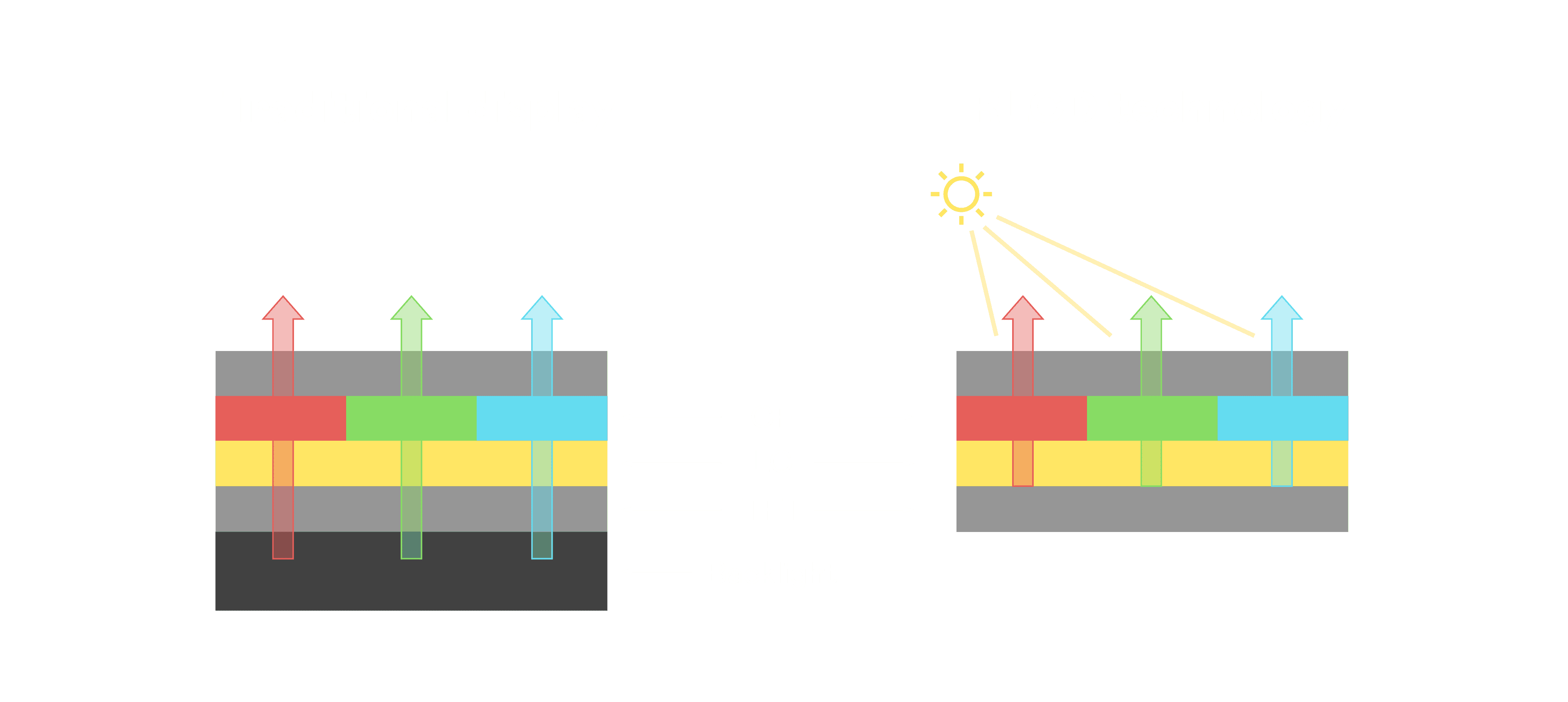 与传统需搭配背光单元的液晶显示相比,,反射式液晶技术不仅更省电、、、、更轻薄,,,且即便在艳阳下仍能清晰显示。。。此外,,,,少了背光单元,,,,也大幅降低了 LED 蓝光伤害眼睛的疑虑。。。。